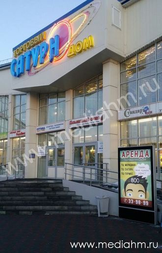 Рекламный щит № 2-Сатурн (скроллер сити-формат) справа от центрального входа в ТРЦ Сатурн, видимое изображение 1200х1800 мм.