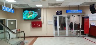 Светодиодный экран, расположен в здании Аэропорта первый этаж, зона регистрации и выхода на посадку. Весь траффик неизбежно охватывает этот экран так как он расположен напротив единственного эскалатора ведущегов зону посадки. Таким образом, мы охватываем 100 % траффика пассажиропотока.